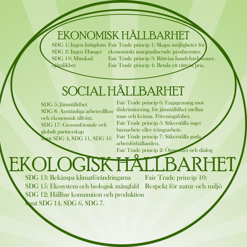 I modellen har förslag till hur mål för Hållbar Utveckling (SDGs) samt, parallellt, Fair Trade principer kan placerats in.
