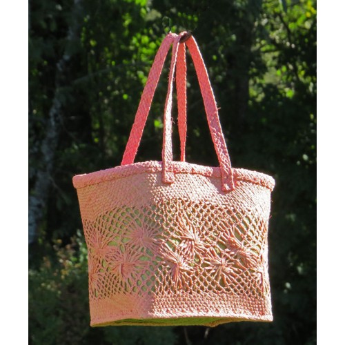 Korgväskan är tillverkad av hantverkarnas lokala, förnyelsebara och hållbara naturmaterial: soltorkade raffiapalmblad och halvgräs som flätats.