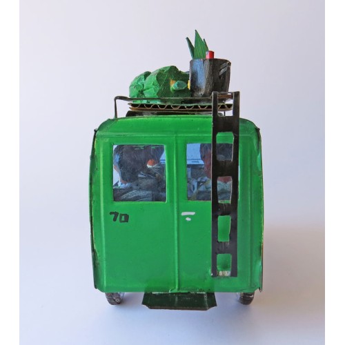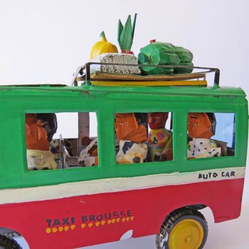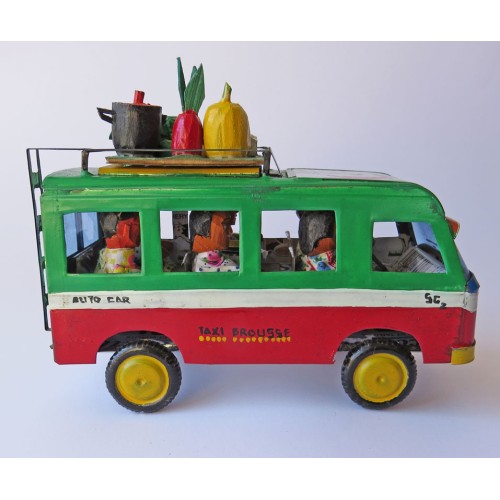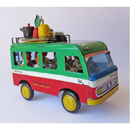 Detaljrikt konsthantverk av recyclat material: Renaultbuss av insamlade burkar etc metallskräp. Chaufför och passagerare (5st) av återbrukad textil och träspill. Bagage på taket (bananstock, gryta etc) snidade av små bitar träspill. För att lasta på passagerarnas bagage, har bussen stege bak.