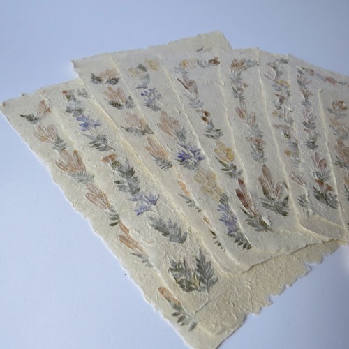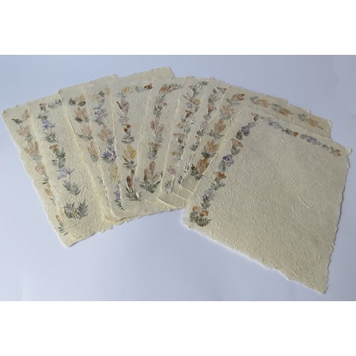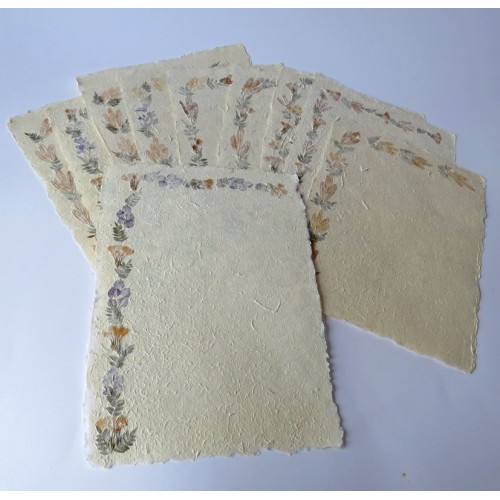 Papperet är handgjort av bark och vatten. Det är ett hantverk med lång tradition som hantverkarna för vidare med stor skicklighet - och mycket vackert resultat. De blomsterdekorerade skrivarken är 28x21cm. Blomsterdekorationen följer den övre och högra kanten på arket.
